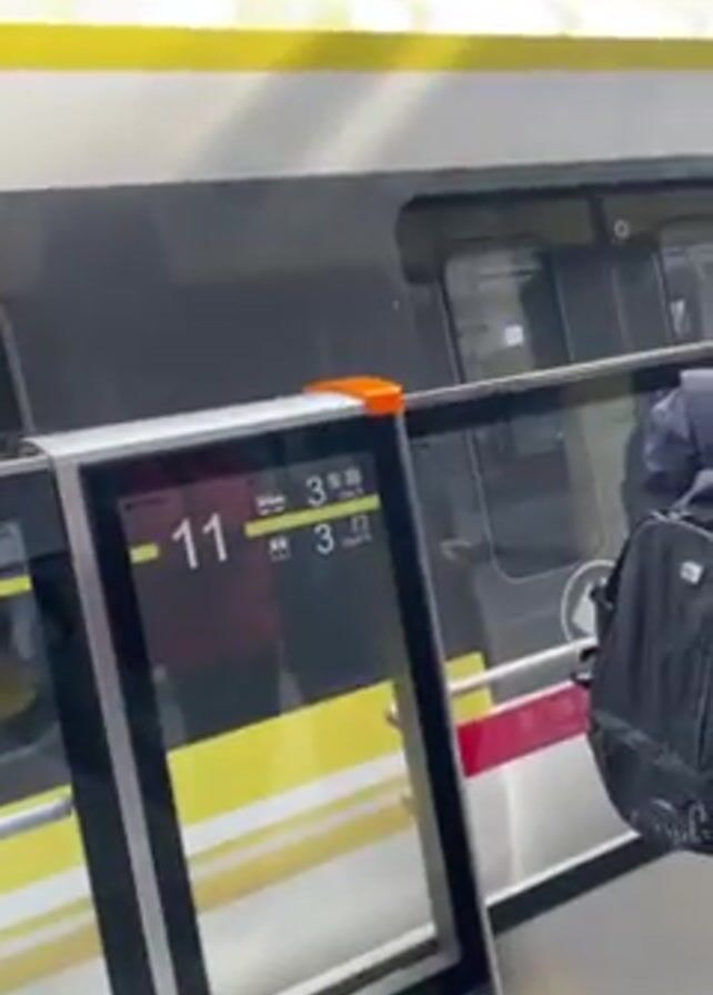doors of a subway train open and people boarding or disembarking. The train is marked with yellow stripes. The doors have digital displays indicating the car number (3) and a seating indicator. Passengers are visible, some wearing masks and carrying luggage. The station platform is visible. The environment appears to be an indoor transit station.