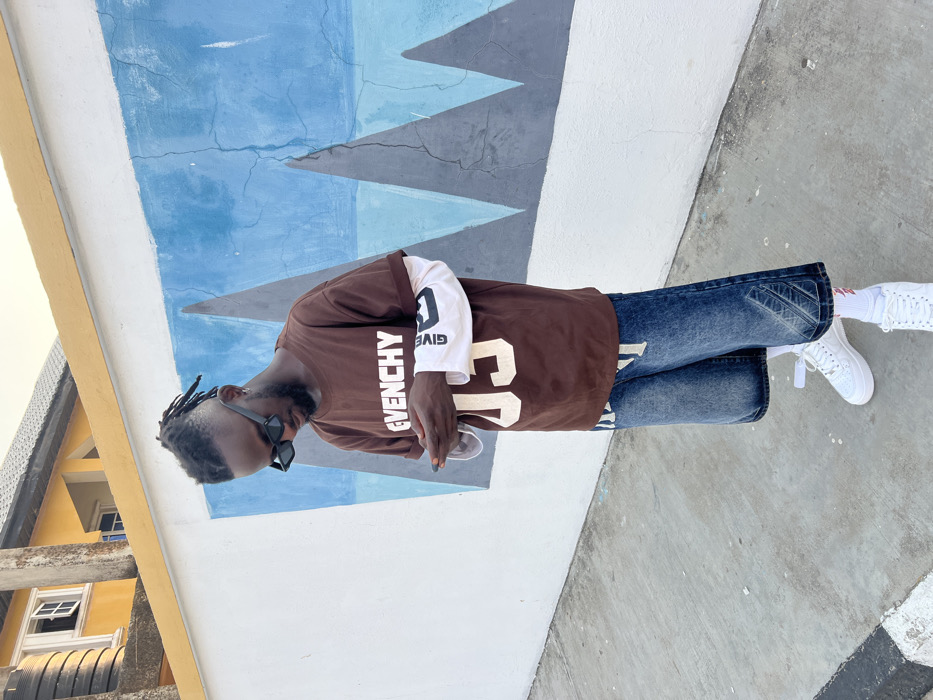 A dark-skinned male subject, approximately late teens to early thirties, stands on a concrete sidewalk in Mopo Onijebu, Nigeria, looking down at a black smartphone held in both hands. He has dreadlocks, wears black rectangular sunglasses, and a small hoop earring in his left ear. His attire includes a brown short-sleeved t-shirt with "GIVENCHY" and "03" in light lettering, layered over a white long-sleeved shirt displaying "GIVENCHY" on the right sleeve. He wears wide-leg, distressed blue denim shorts with a diagonal stitch pattern on the outer lower legs, white socks with red markings, and white low-top sneakers. A clear/white wired earbud or neckband is visible around his neck. Behind the subject is a white wall featuring a mural with abstract blue and grey triangular shapes. Above the wall, a portion of a yellow building with a white-framed window and a black vertical water storage tank is visible. A concrete curb with white and black stripes is present in the lower left.