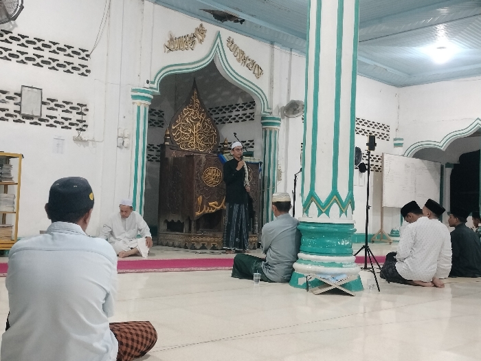 The interior of a mosque in Tumpeun, Indonesia, is depicted, showing a religious gathering. A male speaker stands center-right on a raised pink platform, wearing a black shirt, patterned sarong, and white peci, holding a microphone. Behind him is an intricately carved wooden mihrab or mimbar adorned with golden Arabic calligraphy. To the speaker's right, a tall, striped white and teal column is visible, with a black microphone stand positioned nearby. Approximately seven to ten men are seated on the white tiled floor, facing the speaker. In the foreground, a man with his back to the viewer wears a light blue shirt, plaid sarong, and dark peci. To the left of the speaker, another man in a white robe and white peci sits on the floor. To the right of the speaker, another man in a grey shirt, green sarong, and white peci is seated, with a clear glass of water on the floor in front of him. Further right, a group of three additional men, one in a white patterned shirt and black peci, are also seated. The mosque features white walls, some with dark patterned designs resembling bricks. Wall-mounted fans are visible. A simple wooden shelf filled with books is on the far left. On the far right, a whiteboard with visible writing is mounted on the wall. The ceiling is light blue with white trim, and artificial lighting illuminates the space. A small, open book on a wooden stand rests on the floor near the right-side column.