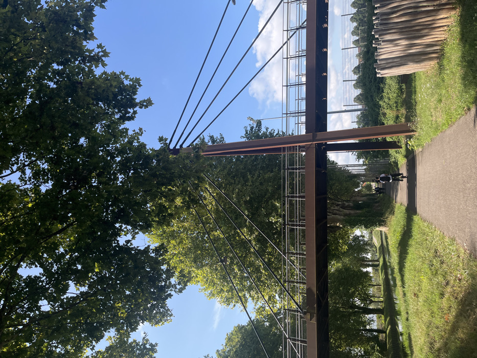 The image captures a paved pathway running parallel to a canal in Eschau, France, under a clear blue sky with scattered white clouds. A modern pedestrian cable-stayed bridge, constructed from weathered reddish-brown metal, spans horizontally across the upper half of the frame. It is supported by a tall, vertical pylon positioned on the right side of the pathway, from which multiple dark tension cables extend diagonally upwards to the bridge deck. The bridge features a metal railing system with horizontal bars and mesh infill. On the paved pathway, a single individual wearing a white top and dark trousers is observed cycling away from the camera, heading into the distance. Further along the path, a group of at least three additional individuals are visible, walking in the same direction. To the left of the pathway, a calm, narrow canal stretches into the background, its surface reflecting the sky and surrounding trees. Grassy verges line both sides of the pathway and the banks of the canal. Large, mature trees with dense green foliage overhang the path and line the waterway, casting dappled shadows. On the far right side of the image, beyond the bridge, a tall metal fence is visible, behind which rows of uniform, smaller trees or bushes are planted. In the immediate foreground on the right, a cylindrical structure constructed from vertical, irregularly shaped wooden logs is present.