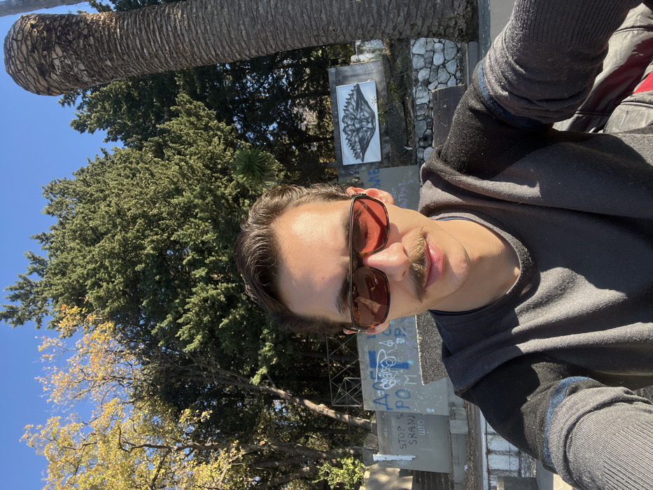 A male individual is depicted in a close-up, front-facing outdoor selfie, situated in Kamenovo, Montenegro