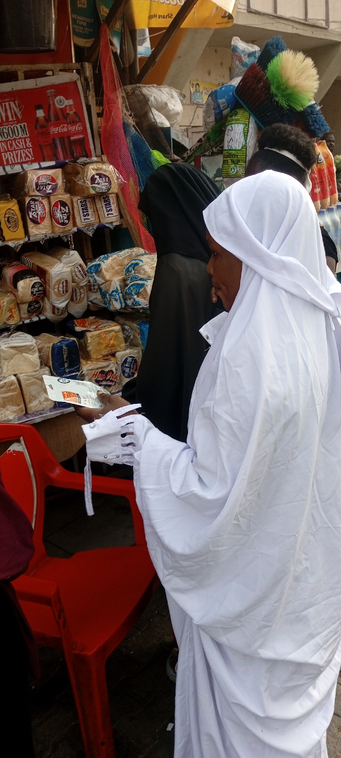 A woman in white, possibly religious attire, stands at a shop with a red chair nearby. The shop sells bread, with brands like "7 Stars" and "Home Pride" visible. A red Coca-Cola advertisement with the text "WIN 600M IN CASH & PRIZES!" is prominently displayed. Behind the woman, another individual in a black garment stands near brooms and mops. The scene appears to be a bustling market area.