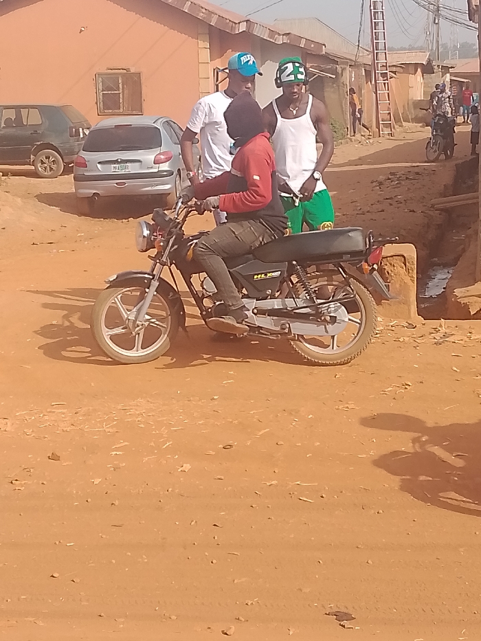 The image displays three adult males on an unpaved, reddish-brown dirt road in an unknown city and location