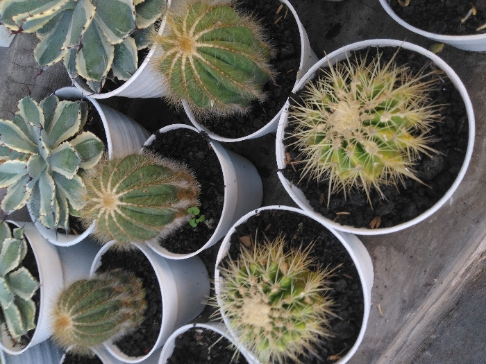 - "The image displays a close-up arrangement of multiple potted plants, primarily cacti and succulents, situated on a weathered grey surface in Venecia, Costa Rica" by FM-AWsTN2, licensed under CC BY 4.0