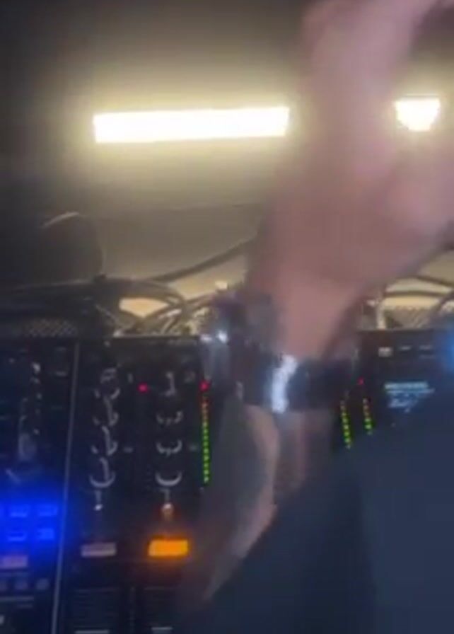 DJ mixer, specifically a Pioneer DJM-900 nexus, under a bright light. A person wearing a white shirt is partially visible in the foreground, occasionally moving their hands around. The mixer has several channels with illuminated level indicators and knobs. Cables are visible behind the mixer. The overall setting seems to be a nightclub or DJ booth. The person appears to be manipulating the mixer's controls, likely mixing music.