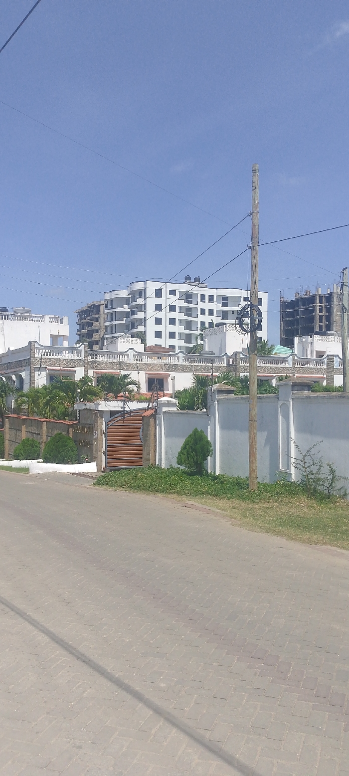 The image presents an outdoor street-level view in Ziwa La Ng'ombe ward, Kenya, under a clear blue sky. The foreground features a paved road composed of grey interlocking blocks laid in a herringbone pattern. A slender shadow extends diagonally across the road from the lower-left. A strip of green, low-lying vegetation and grass borders the road on the right. In the midground, a prominent white perimeter wall with decorative coping and pilasters extends horizontally. A recessed, brown, horizontally slatted gate, likely metal, is visible within the wall on the left. Behind the wall, dense tropical foliage, including palm trees and various shrubs, is present. A wooden utility pole, supporting multiple coiled black cables, stands upright on the right side of the road. A white, single-story building with a decorative balustrade along its roofline is partially visible behind the perimeter wall. The background displays several multi-story buildings. A large, white, modern high-rise structure with numerous dark windows or balconies and a curved facade dominates the central background. To its right, a darker, multi-story building is under construction, characterized by exposed concrete and scaffolding. A less distinct white building is partially visible on the far left. The upper section of the image consists of a clear, unclouded blue sky. No individuals or specific activities are discernible within the scene.