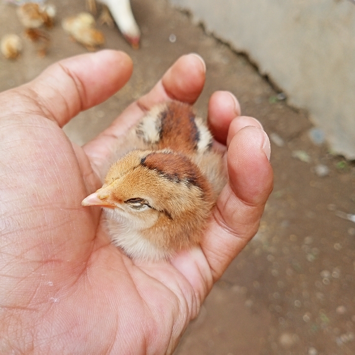 A human hand with a light brown skin tone, specifically the palm and fingers, is depicted holding a small chick. The chick, characterized by its tan and brown down feathers with dark brown stripes on its back, rests with its eyes closed and a pale orange beak. In the blurred background, several other chicks of similar appearance are visible on a brownish ground surface. A larger, white avian creature, possibly an adult chicken or goose, is partially observed in the upper background with its head oriented downwards. The ground beneath the birds appears to be an uneven mixture of dirt and concrete, featuring a crack on the right side. The scene is situated in Ketowan, Indonesia.