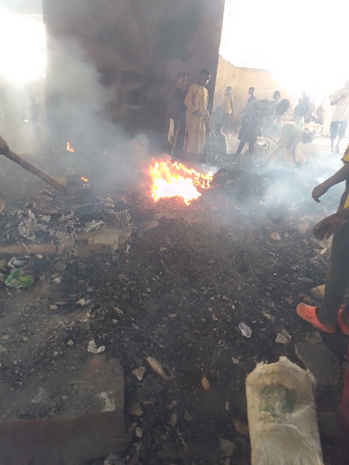 The scene is an open area in Jos, Nigeria, located at 9.923 latitude and 8.891 longitude. A fire is burning in the center of the scene, with flames and smoke billowing upwards. The ground is covered in ash, debris, and rubble. There are several people standing around the fire, some of whom are wearing clothing that appears to be burned. The scene is characterized by the presence of smoke, fire, and debris, suggesting a recent fire or burning event. The environment is dusty and dry.