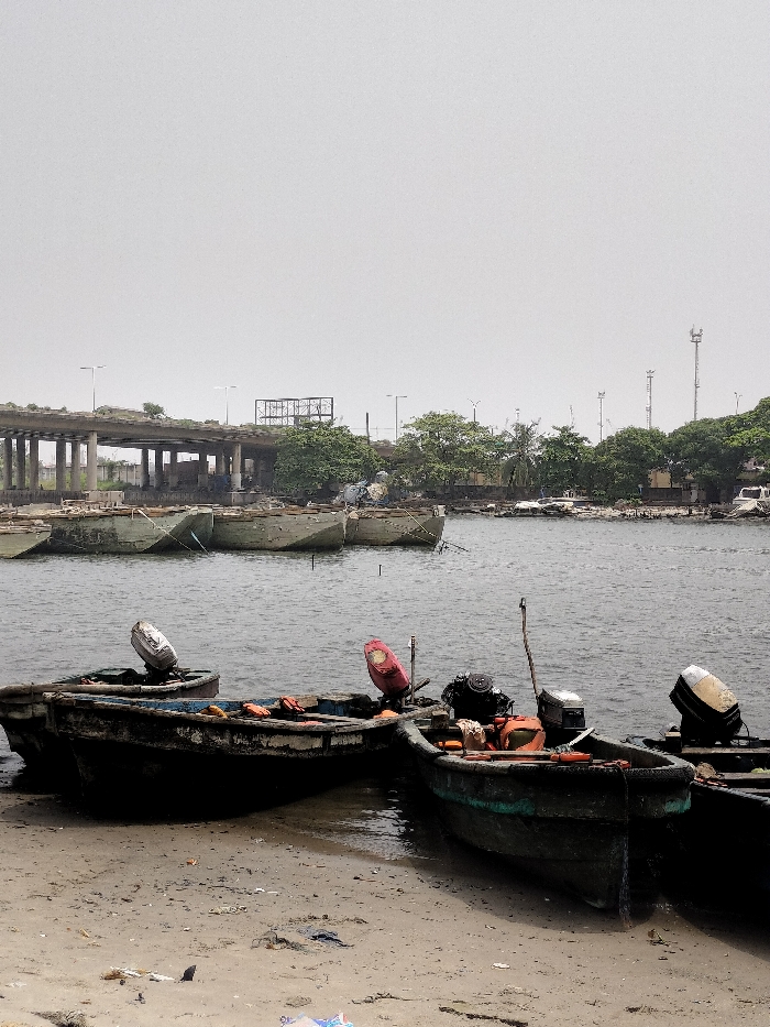 Several fishing boats are beached on a sandy shore. Each boat has an outboard motor. The water behind the boats is calm. In the background is a dilapidated concrete bridge, trees, and communications towers. The sky is overcast and gray. The scene conveys a sense of age, decay, and inactivity. Debris litters the shoreline.