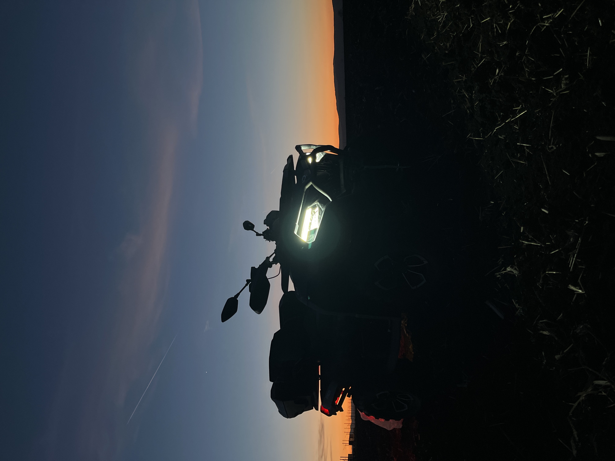 The image depicts a motorcycle parked in a grassy area at dusk in Kostinbrod, Bulgaria. The motorcycle's headlight is illuminated, providing a point of focus in the dim lighting. The sky exhibits a gradient from dark blue to orange near the horizon, indicating either sunrise or sunset. The surroundings are mostly dark, making it difficult to discern specific details beyond the immediate vicinity of the motorcycle. The foreground contains indistinct vegetation. The background includes a silhouette of distant hills.