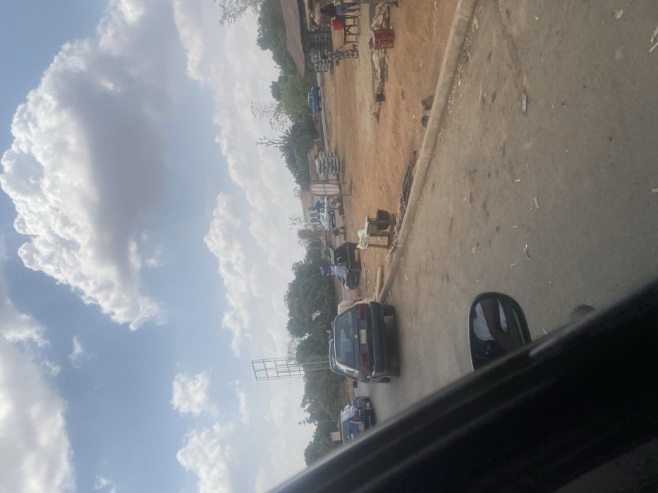 The image displays a daytime street scene in Andaha, Nigeria, viewed from the interior of a vehicle, with a partial view of the car's side door and mirror in the lower left foreground. The sky is bright blue with scattered white cumulus clouds. In the mid-ground, a dark-colored station wagon, possibly a Volkswagen Golf variant, is positioned on a paved road, facing away from the viewer. Behind it, a blue sedan and another vehicle are partially visible. To the right of the paved road, a wide, unpaved area of reddish-brown dirt extends into the background. On this unpaved area, a black sedan with its trunk open is parked. Nearby, multiple stacks of large bags, consistent with building materials such as cement, are arranged. Further right, a small, open-sided structure with a corrugated metal roof stands. Two individuals are present near this structure; one person, wearing patterned clothing, stands near a wooden table holding a red plastic basin and other objects. Another person is partially visible near the stall. In the left mid-ground, a metal scaffolding-like structure, likely intended for a billboard, stands without any display material. Various trees and dense foliage line the background and mid-ground. A blue sedan is visible on a road section further in the distance on the right. The scene depicts an active roadside environment with elements of commerce and transportation.