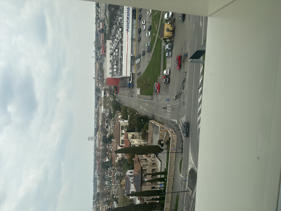 This image presents an elevated view of a section of Treviso, Italy, centered on the Panorama supermarket located at Via Castellana, 107. The scene is under an overcast sky, indicating daylight conditions. In the mid-ground, a paved road, likely Via Castellana, runs diagonally from the lower-left, curving towards the right. It forms an intersection with a branching road leading directly to the supermarket. A dark grey SUV is observed in motion, executing a left turn at a roundabout in the lower-left quadrant of the intersection. One individual, wearing dark clothing, is walking across a marked pedestrian crosswalk on the road approaching the supermarket, moving from the left side of the road to the right. To the left of the main road, a residential area is visible, featuring multi-story buildings with tiled roofs, light-colored facades, and prominent cypress trees. Some residential roofs are equipped with solar panels. Property boundaries are defined by stone walls. To the right of the road, the Panorama supermarket dominates, identifiable by its large, flat-roofed structure with red and white exterior components, prominently displaying "PANORAMA" and "DOMENICA APERTO" signage. An associated parking lot, containing approximately two dozen parked vehicles, occupies the space in front of the supermarket. A small, yellow, single-story kiosk-like building is situated near the parking lot entrance, adjacent to several parked cars. The background features a dense urban horizon with numerous buildings and trees, including a distinctive tall, slender, light-colored cylindrical structure with a pointed top visible in the distance, slightly left of center. The immediate foreground is obstructed by a plain white horizontal surface, likely a windowsill or railing.