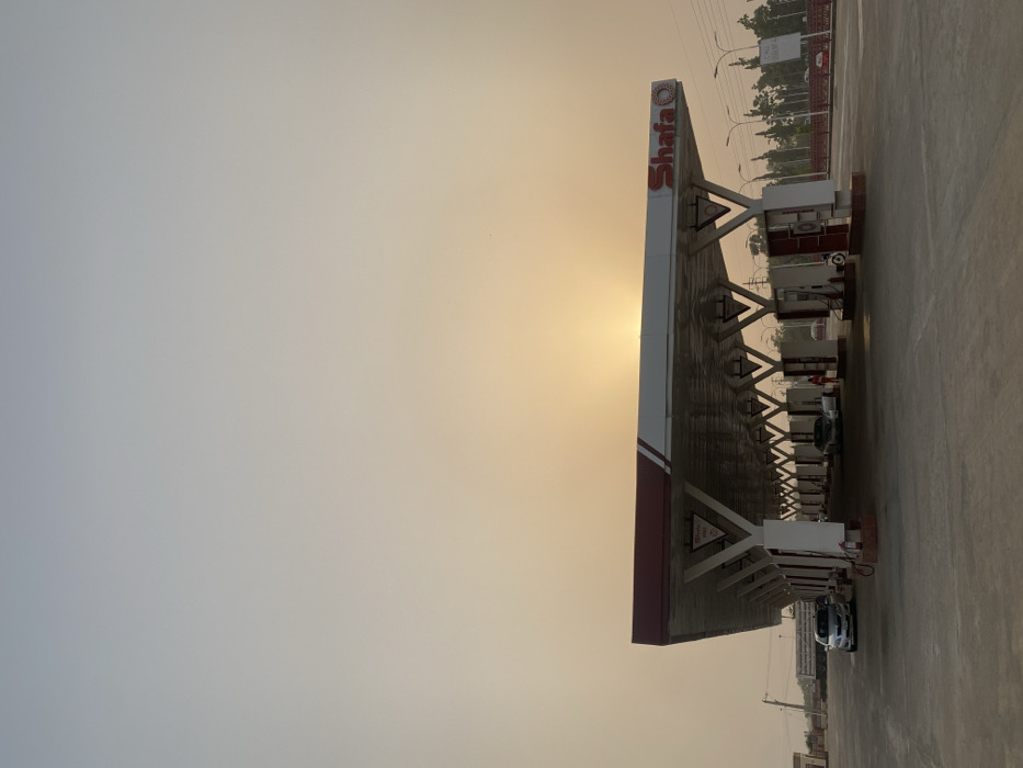 A side-angled view of a "Shafa" gas station under a bright, hazy sky