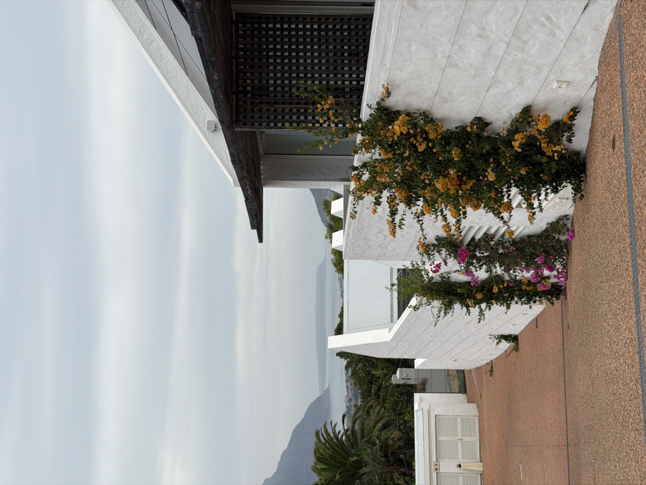 The image displays a residential scene in Hout Bay, South Africa, under an overcast, light grey sky. In the background, a body of water, consistent with Hout Bay, stretches between distant, green mountains, with a prominent landmass visible in the mid-distance of the bay. The foreground features a sloping, reddish-brown aggregate paved driveway. To the right, a textured, white-stuccoed building, likely a residence, rises from the ground. Its upper section includes a pitched roof with visible solar panels and a dark, slatted wooden screen covering a window or balcony, shaded by a flat, dark awning. A substantial white wall, part of this structure, runs along the driveway, adorned with vibrant climbing bougainvillea plants displaying both yellow-orange and pink-magenta flowers. Below this wall and further back, a lower white building with a corrugated metal roof is partially visible. To the left of the driveway, a smaller white outbuilding or garage with two louvered white garage doors and a single pedestrian door is present. Beyond this structure, a dark metal gate can be seen, partially obscured by green foliage, including palm trees. No individuals are visible within the frame.