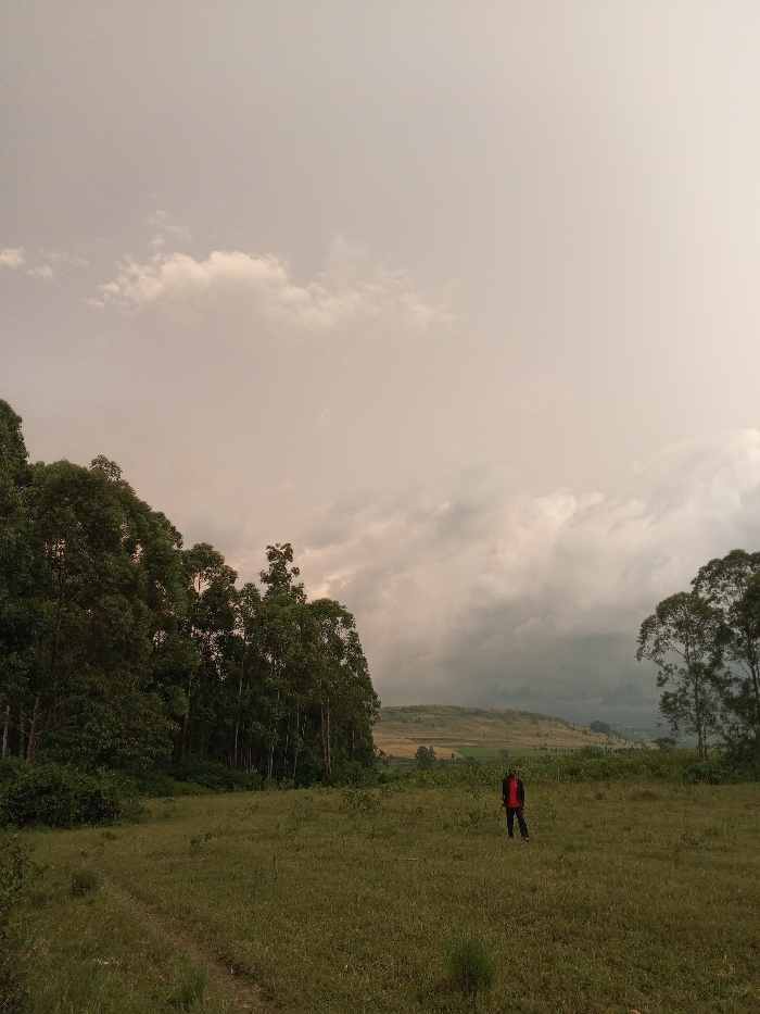 A figure stands in a grassy field, dressed in dark pants and a red top. Towering trees line the left of the frame, contrasting with the open field. In the distance, a low-lying hill is visible, with hints of farmland or fields. The sky is overcast with shades of grey, suggesting an approaching storm or a cloudy day. The overall impression is one of a natural, rural landscape under a heavy sky.