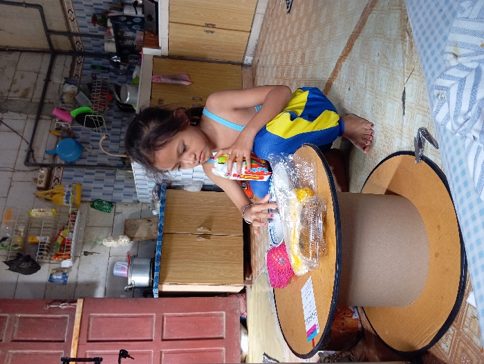 The scene depicts an indoor domestic setting, likely a kitchen or utility area, in Baron, Indonesia. A young girl, approximately 5-10 years old, with dark hair, is positioned in a squatting or kneeling posture on a light-colored, patterned linoleum floor. She wears a light blue sleeveless top and blue and yellow track pants; her feet are bare. On her right wrist are several thin bracelets, and her fingernails are painted pink. In front of the girl is a low, circular table constructed from a large wooden cable spool with black-edged top and bottom sections. On the table, from left to right, are a pink spiky object, a white paper with a red stripe, a white bowl with a blue rim containing clear contents, and several items of food individually wrapped in clear plastic. The girl holds a small, white rectangular carton with colorful graphics to her mouth with her left hand, appearing to drink from it. Her right hand is positioned near the white bowl on the table. In the background, a kitchen area is visible. To the left, a reddish-brown wooden cabinet or door frame stands. Exposed electrical conduits run along the upper walls. The wall behind the kitchen counter features blue and white checkered tiles, while a section to the left appears to be an unfinished light-colored concrete wall. Below the tiled wall, light brown wooden base cabinets support a countertop, which is blue and white checkered on the left side and white on the right. A stainless steel sink is present between these counter sections. Various kitchen items, including a silver pot, a blue bowl, yellow and pink utensils, and a black plastic bag, hang from shelves and hooks on the wall. A small stove or hot plate is visible on the right-hand counter. On the floor to the right of the table, a pair of metal nail clippers rests next to a rolled-up piece of white and light blue checkered fabric.