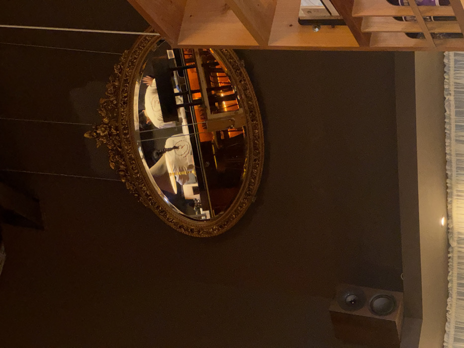 A brown wall features an oval, ornate gold-framed mirror. Reflected in the mirror is a person in a white shirt and an orange-toned structure. Above the mirror is a wooden shelf-like structure. A rectangular speaker is mounted on the wall beneath the mirror, close to a curtained edge.
