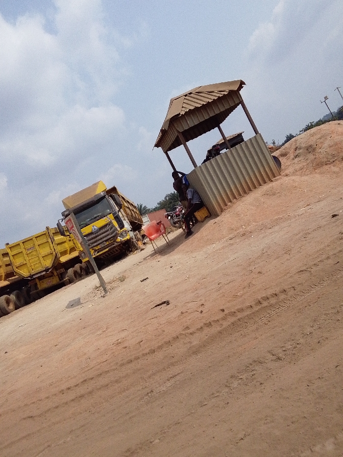 The scene, located in Hoche, Nigeria, presents an unpaved, reddish-brown dirt landscape under a partly cloudy sky. A yellow multi-axle dump truck with a matching trailer is parked on the left, its front bumper showing damage. A slender dark pole stands vertically in the mid-left foreground, with an orange plastic chair positioned near its base on the dirt ground. To the right, a rudimentary shelter features a multi-faceted brown roof and corrugated metal walls. Two individuals are partially visible within or near the shelter; one stands leaning, and another is seated. A red motorcycle is parked adjacent to the shelter. Tire tracks are etched into the dirt surface. The background reveals green vegetation, a large earthen mound on the right, and a utility pole with horizontal crossarms against the distant sky.