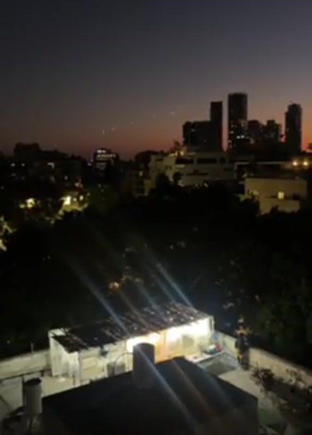 cityscape at dusk. In the foreground, there's a rooftop with a structure covered in a white fabric and illuminated from within, casting bright rays of light. Next to it, a person stands on the rooftop. The cityscape includes buildings of various heights, some shrouded in darkness and some lit up. Trees fill the space between the rooftop and the buildings, creating a layered visual effect. The sky is a deep hue of purple and orange.
