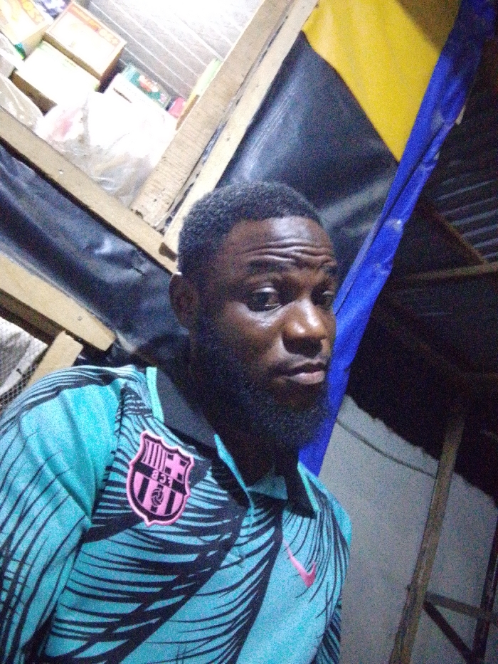 A man with dark hair and a beard is wearing a turquoise and black Barcelona FC shirt. He is positioned in what appears to be a store or storage space. A shelf filled with items is visible above him, and a flag-like object with yellow, black, and blue sections is behind him. A ladder is positioned to the right of the man. The lighting is somewhat dim.