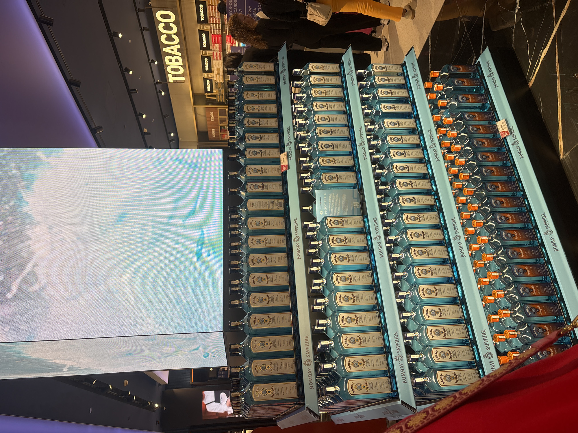 display of Bombay Sapphire gin bottles in a duty-free shop, likely at an airport