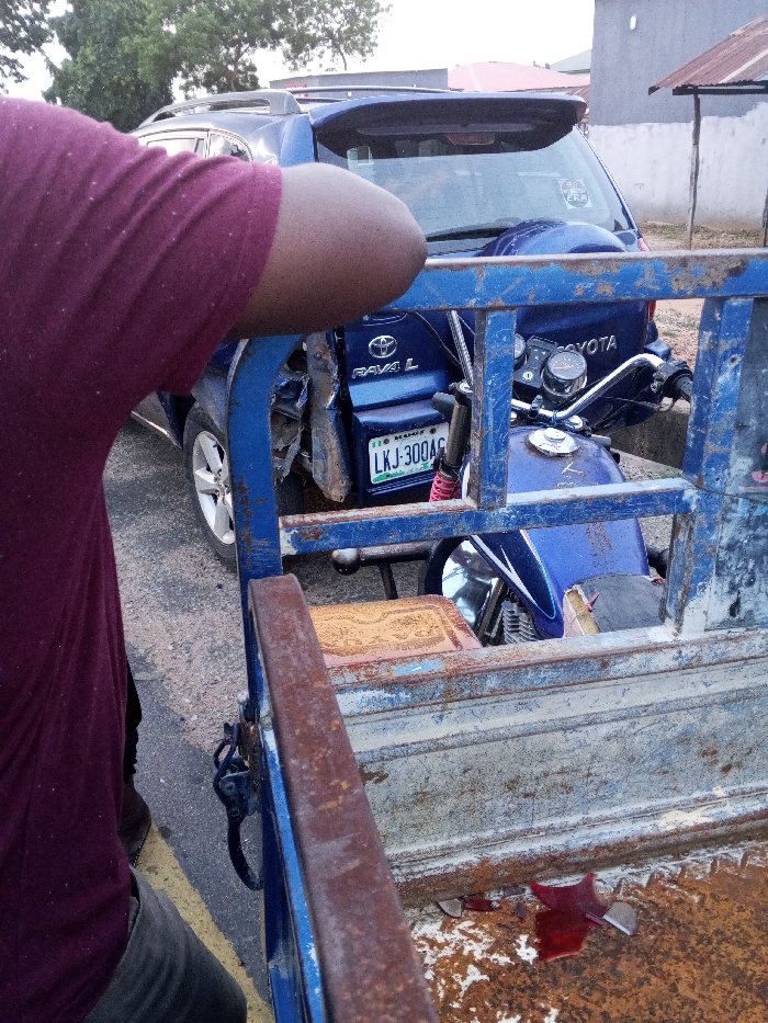 The scene depicts the aftermath of a vehicular collision on a paved road in Adankolo, Nigeria. A blue Toyota RAV4 L SUV, bearing Nigerian license plate LKJ-300AG, sustained significant rear-end damage, particularly to its driver's side taillight and bumper area. The rear spare tire is visible. A blue motorcycle, appearing to be the power unit of a commercial tricycle (Keke NAPEP), is wedged into the damaged rear of the SUV. The motorcycle's handlebars, speedometer, fuel tank, and front headlight are visible, along with a red front suspension spring. In the immediate foreground, the rusted blue metal frame and cargo bed of the tricycle are prominent. Red shards, consistent with shattered plastic from a vehicle component (likely a taillight or reflector), are scattered on the rusted floor of the cargo bed. A person, whose torso and right arm are visible, wearing a maroon short-sleeved shirt and dark pants, stands near the tricycle, partially obscuring the view. The road features a faded yellow line marking its edge. The background includes light-colored buildings, some with reddish roofs, and scattered trees under an overcast sky. No active movement or specific interactions are observed.