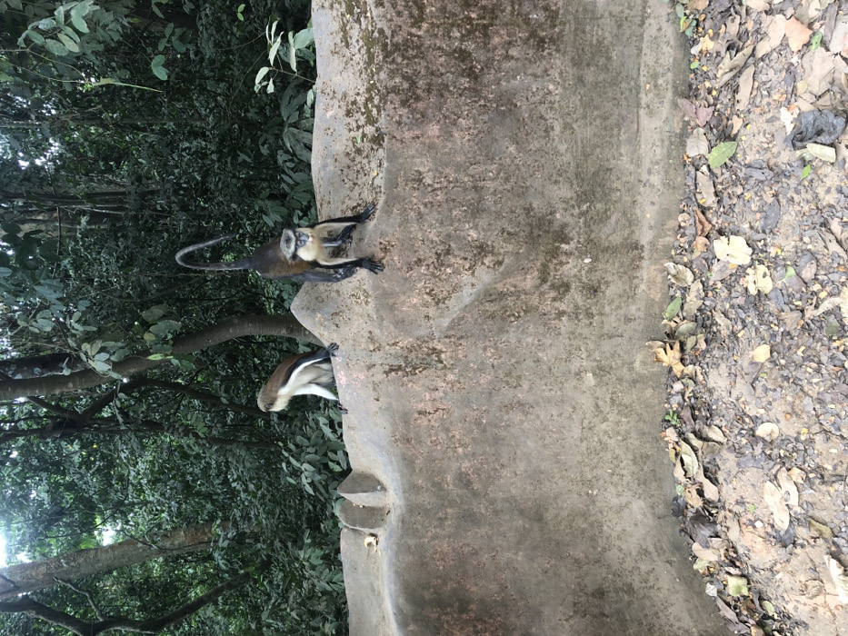 This image depicts an outdoor scene within the Osun-Osogbo Sacred Grove in Osogbo, Nigeria. The foreground consists of ground covered with dried leaves, small stones, and dark soil. A low, textured, light grey concrete barrier, featuring an irregular and undulating top surface, extends horizontally across the mid-ground. A yellowed banana peel is visible on the barrier's top surface, positioned on the left side of the frame. Two monkeys are present on the barrier. On the right, one monkey with dark grey/black fur, prominent white markings on its face and chest, and a long, upward-curving tail is captured in a semi-crouching posture, with its front limbs on the barrier's edge, facing directly towards the viewer. To its left, a second monkey, displaying white fur on its underside and inner limbs, contrasting with brown/grey fur on its back, is seated upright on the barrier, facing away from the viewer towards the left side of the frame. The background is composed of dense, verdant tropical forest with numerous trees and thick green foliage.