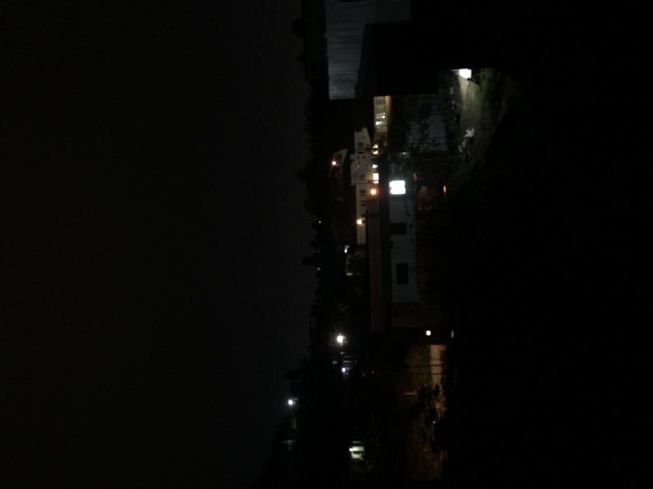 A night scene presents several structures with illuminated windows and outdoor lights. Some appear to be houses or buildings on a hill, descending into darker foliage. The left side of the image is predominantly dark, suggesting a vast expanse of night sky or obscured land. Streetlights are visible along a road or path, further defining the residential or developed area.
