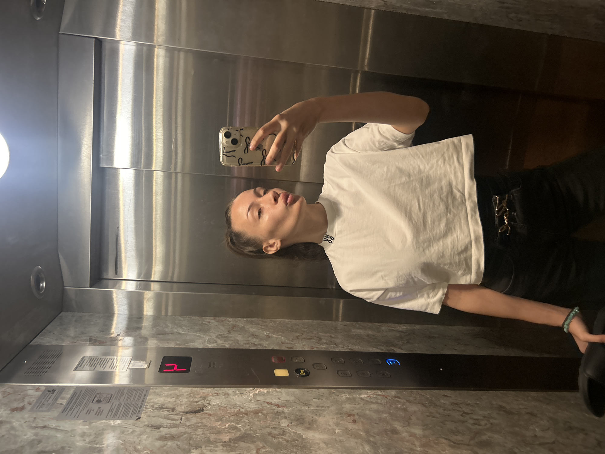 A woman is taking a selfie in an elevator. The elevator has a stainless steel interior and a panel with floor buttons. The "4" button is illuminated. The woman is wearing a white t-shirt and black pants. She is holding her phone up to take the picture. The location is in Burgas, Bulgaria.