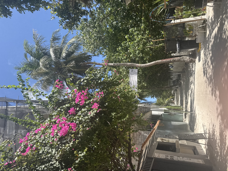 The image displays a narrow, unpaved sandy pathway in Ukulhas, Maldives, under a clear blue sky. On the left, a building is partially obscured by a vibrant bougainvillea bush covered in pink flowers, with scaffolding visible on the upper section of the structure. Adjacent to the pathway on the left, a small, single-story building with a corrugated metal roof and an A-frame menu board positioned on the sand is visible. Further down this side, additional buildings constructed from light-colored blocks line the path. A tall coconut palm tree with a slightly curved trunk stands prominently in the center-right of the frame, surrounded by dense green tropical foliage. On the right side, a partial white picket fence, a black wheeled trash bin, and various plants and objects are discernible behind the foliage. A white banner or sign is suspended horizontally across the pathway in the mid-ground. Sunlight casts distinct shadows from the trees and structures onto the sandy ground. No individuals or specific actions are depicted.