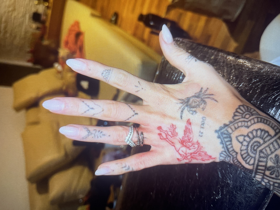 The image displays a close-up, slightly elevated perspective of a person's left hand, prominently featuring multiple tattoos and jewelry, against a blurred indoor background
