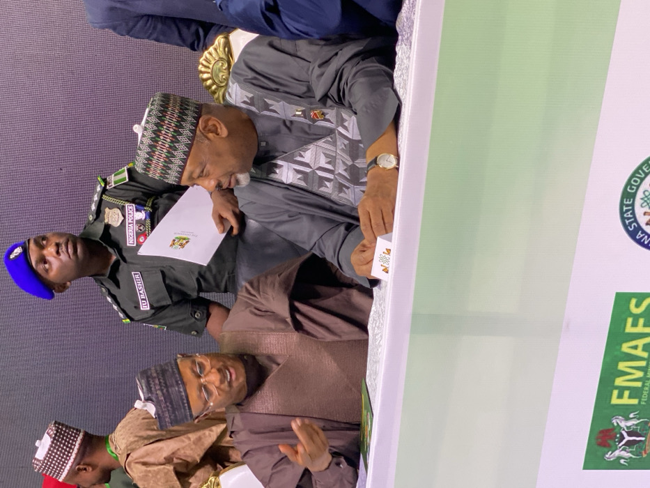 The image captures an indoor event in Unguwar Sarki, Nigeria, with three individuals prominently featured in the mid-ground
