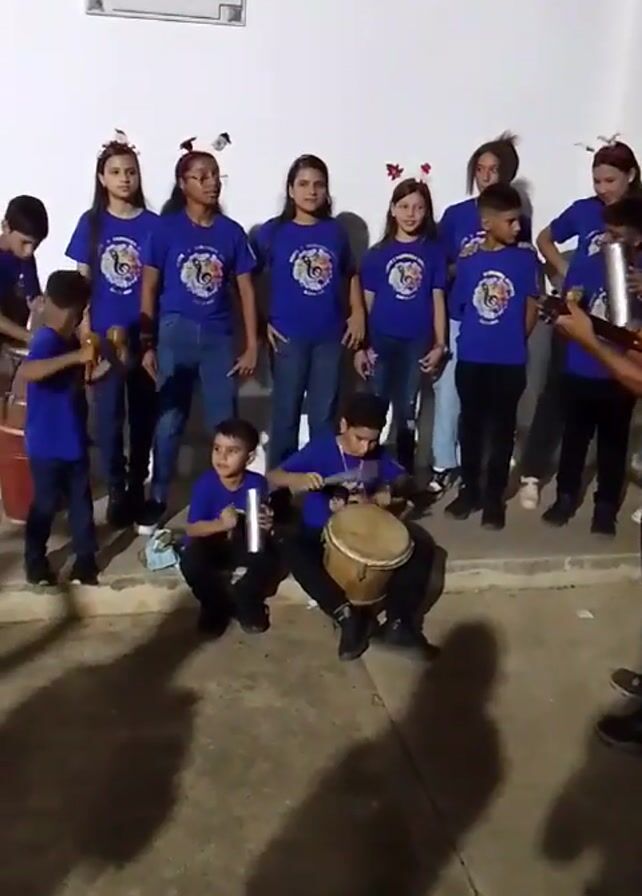 A group of children and adults are performing music in an outdoor setting. The group consists of about a dozen children, mostly girls, and several adults. Everyone is wearing matching blue t-shirts with a logo. Many of the children are wearing festive headbands with antennae. Some of the children are standing, while others are sitting on a small raised platform. They are playing various instruments, including a small drum, a guitar, and shaker instruments. A man is playing the guitar, and a woman is standing next to him, clapping along. The scene appears to be taking place in a public area, possibly in front of a building with a white wall. The lighting is somewhat dim, and shadows are cast on the ground. The atmosphere seems cheerful and festive.