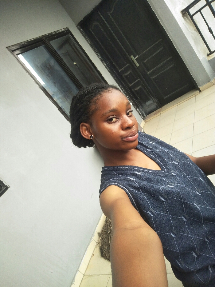 A young Black female is depicted in a selfie, positioned slightly off-center to the right, within Cotonou, Benin