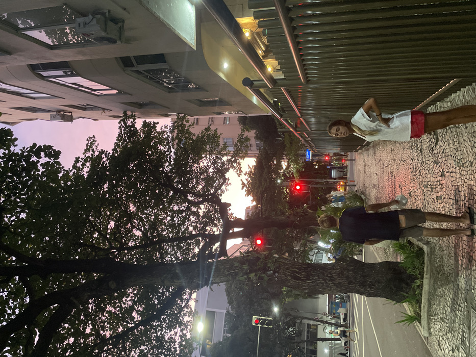 A street scene shows two people walking on a patterned sidewalk. A woman in a white shirt and red shorts stands near a metal railing, looking towards the camera. A man in a dark shirt and shorts walks in the opposite direction. Trees line the street, their branches reaching up toward buildings. Traffic lights are visible along the road. The sky is a mix of colors, suggesting dusk or dawn.