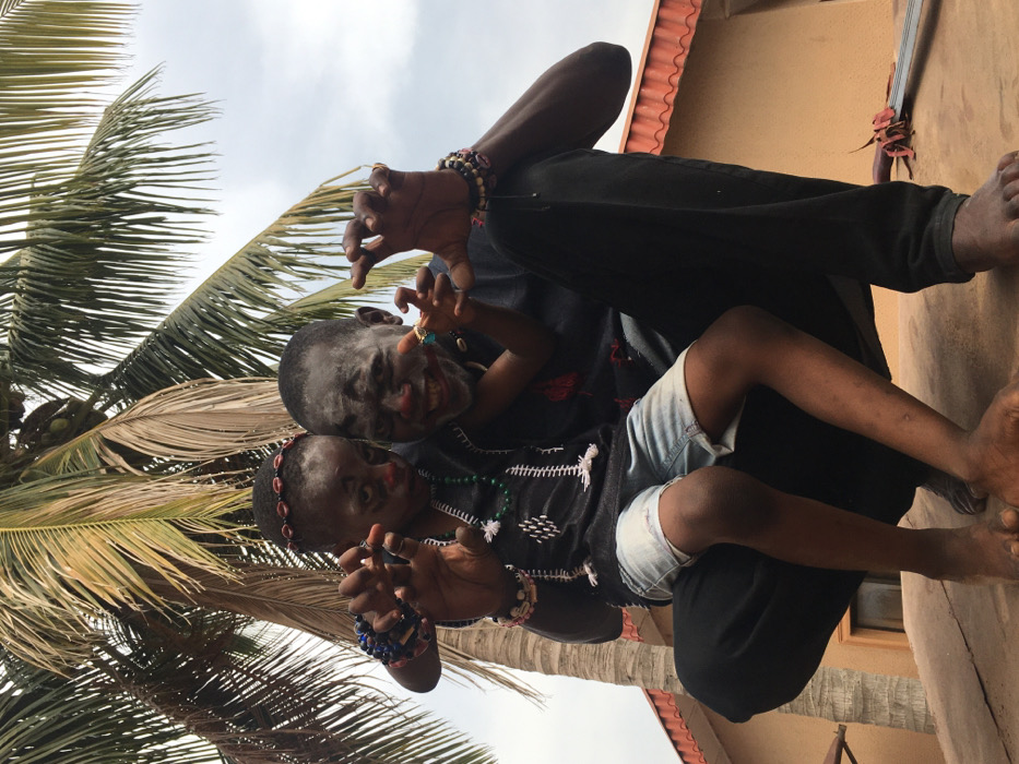 The image displays two individuals, an adult and a child, located in Sabon Tasha, Nigeria. Both individuals have dark complexions, and their faces are painted with white, red, and dark markings, resembling traditional or theatrical makeup. The adult, an individual with dark skin, is crouching or squatting, dressed in a dark shirt and dark trousers. Multiple beaded bracelets are worn on both wrists, and a ring is visible on the right ring finger. This individual smiles broadly, revealing teeth. The child, also with dark skin, is positioned in front of the adult, wearing a dark shirt with white embroidered patterns and light blue denim shorts. The child also has multiple beaded bracelets on both wrists and a green beaded necklace. Both the adult and the child have bare feet. Both individuals have their hands raised towards the camera, with fingers splayed and slightly curled in a "scary" gesture. The background features a large palm tree with green fronds, prominent against an overcast sky. In the lower background, sections of two buildings are visible, characterized by reddish-orange corrugated roofs and light brownish-orange colored walls.