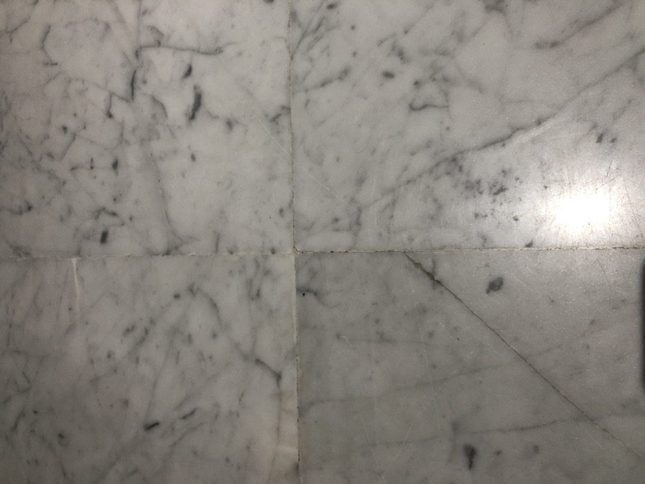The image displays a close-up, overhead view of an interior floor located in Kafr Sousa Municipality, Syria. The floor is constructed from multiple light-colored marble tiles, predominantly white with irregular grey to dark grey veining and scattered black specks. Several individual tiles are visible, joined by thin, darker grout lines forming a grid pattern. A clear intersection of four grout lines is present near the center of the frame, marking where four tiles meet. One tile in the lower-left quadrant exhibits a distinct diagonal crack or fissure. Minor surface wear, including faint scratches and localized discoloration along the grout lines, is apparent across the tiled surface. A bright, specular reflection from an unknown light source is visible on the tile in the lower-right portion of the image. No people, other objects, or specific actions are depicted within the scene.