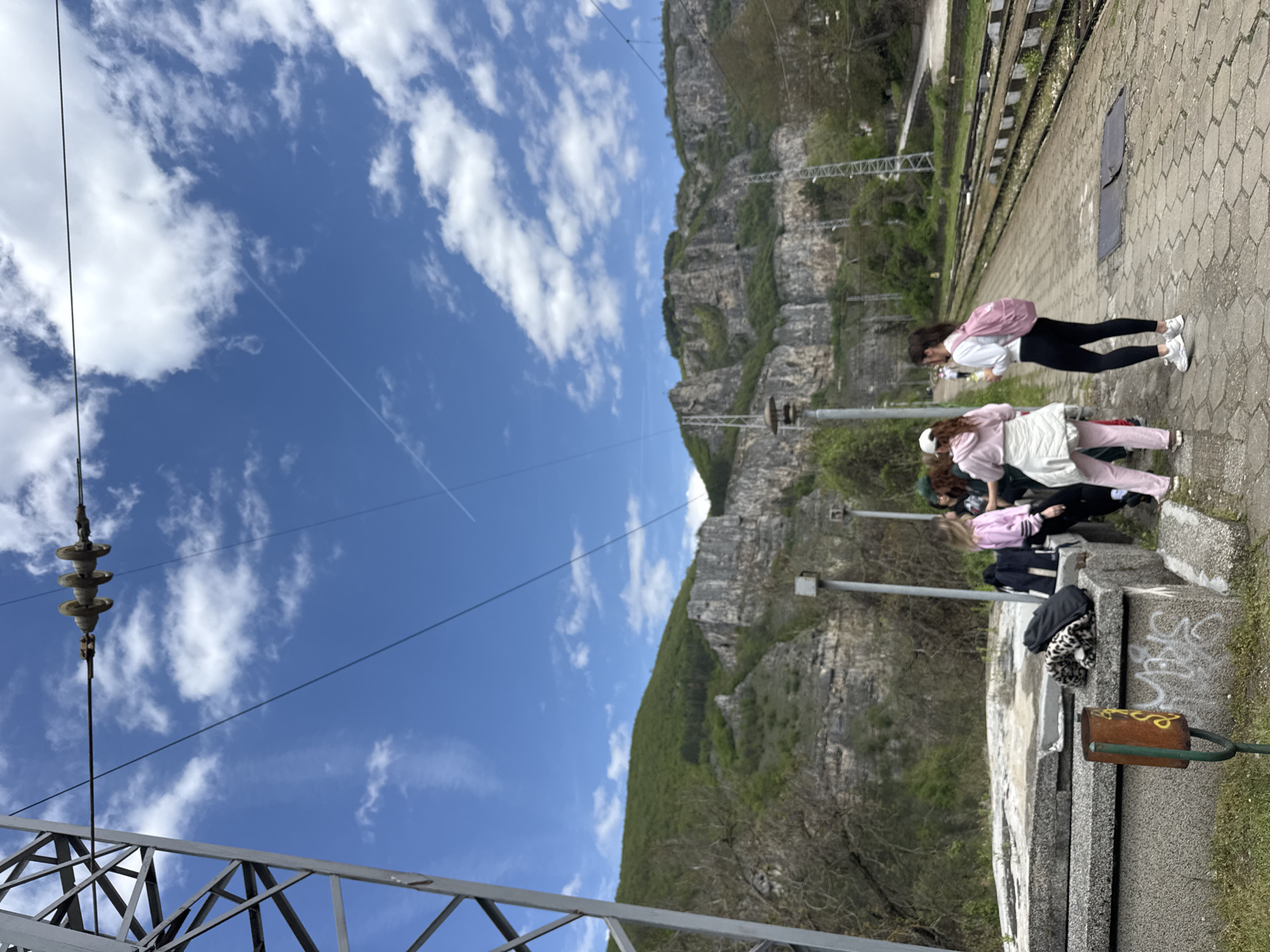 Captured at Milanovo, Bulgaria, the image depicts a group of young women at a train station. One is standing with a pink backpack and black leggings, while others huddle on a low concrete wall near the platform edge. Luggage is piled next to them. A tall cliff face rises behind the station with an overhead power line system running above the group. A cloudy blue sky is visible in the background. The foreground reveals a section of a metal train station structure.