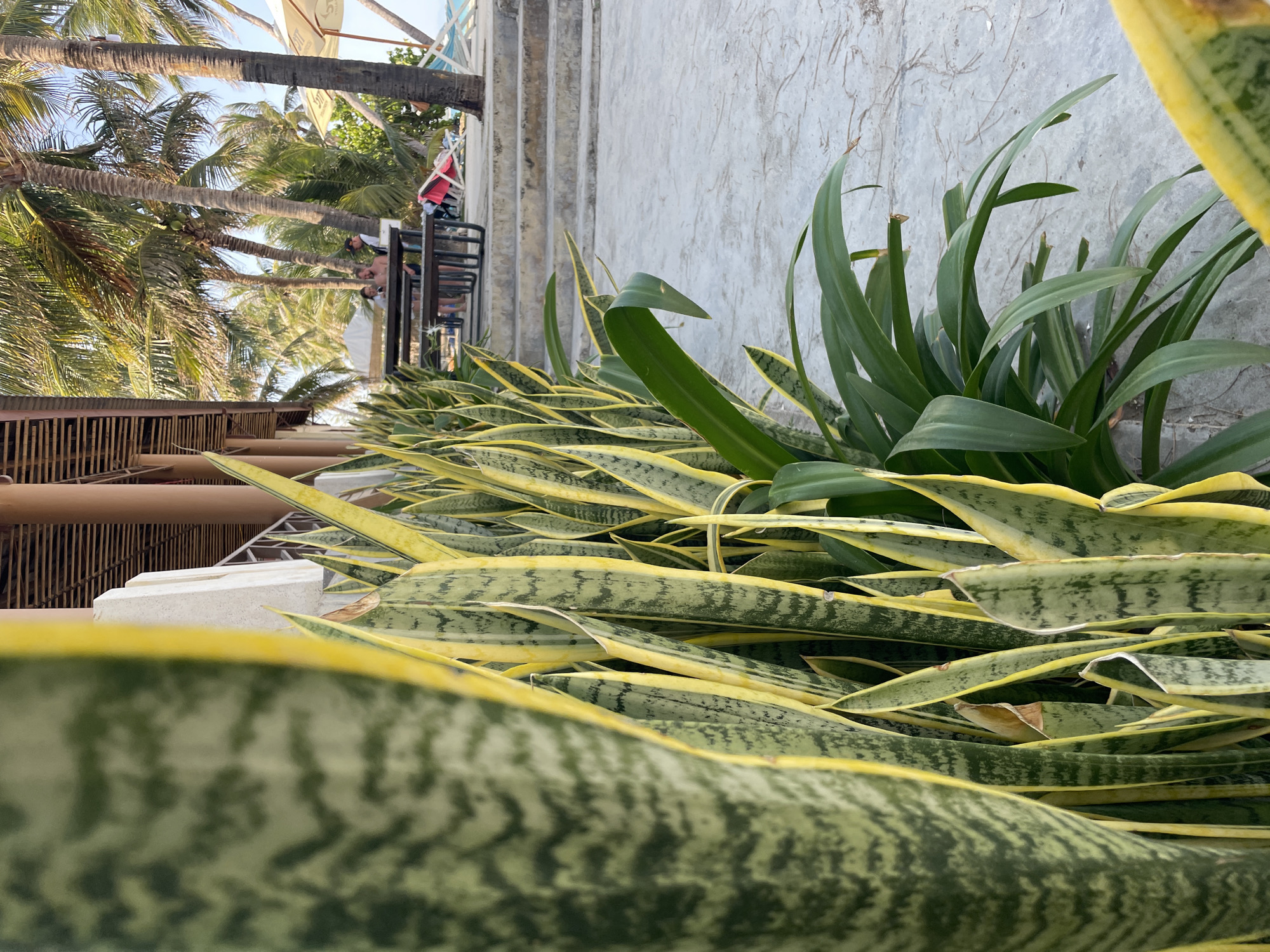 The image depicts a close-up view of snake plants (Sansevieria trifasciata) growing along a concrete wall, likely in an outdoor setting. The scene includes views of palm trees and people. A wooden fence is visible in the background. The setting is likely Dong Ninh Hoa, Vietnam.