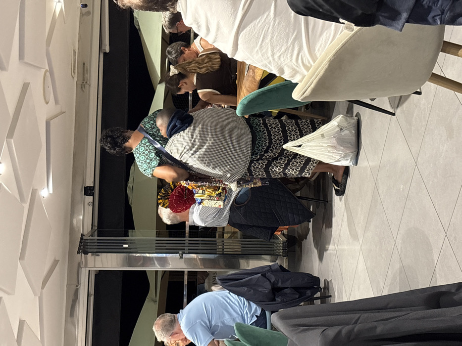 This image depicts an indoor dining area of a restaurant in Cádiz, Spain, during nighttime. The scene is dominated by a dark-skinned individual, viewed from behind, wearing a patterned teal and dark blue short-sleeved top and a long black and white patterned skirt. This individual carries a small child, whose head is visible, on their back in a grey and white checkered fabric sling. The individual also carries multiple colorful, fan-like textile items and strings of beads, possibly merchandise, in their left hand. A white plastic bag rests on the light grey tiled floor near their feet. Several other individuals, patrons of the restaurant, are seated at tables. To the left, a fair-skinned male in a light blue polo shirt is seated, with a dark jacket draped over his chair. Another male is partially visible to his right, seated with a quilted dark jacket over his chair. Further right, a young female with light brown hair in a ponytail and an older female with short dark hair are visible from behind, seated at a wooden-topped table. A portion of a diner in a white shirt is visible in the foreground right. The restaurant features a modern aesthetic with a light grey tiled floor, tables with dark wooden tops, and chairs upholstered in cream, green, or black. The ceiling is white with square and rectangular panels and recessed lighting fixtures. A large glass partition, appearing to be folding doors, separates the indoor dining area from an outdoor patio where light-colored umbrellas are visible against a dark background, indicating the time of day.