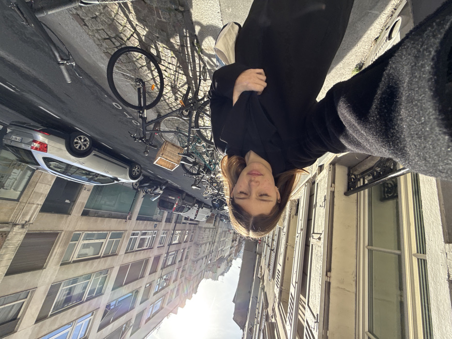 An outdoor urban scene is depicted from an oblique, upward-angled perspective, showing a street in Paris, France. In the foreground, a young female with light brown hair and visible freckles is featured, with her eyes closed. She wears a dark, possibly black, long coat and holds it with her left hand near her chest. Her right arm is extended, indicating she is taking a selfie. Behind and to her right, a cobblestone sidewalk is visible, alongside which numerous bicycles, some equipped with front wicker baskets, are parked. Several scooters are also present. The street itself is paved with asphalt, where a silver SUV (license plate partially visible, containing "DD") is parked. Tall, multi-story buildings with light-colored, Haussmannian-style facades line the street, featuring multiple windows, some with closed external shutters, and decorative wrought-iron balconies on lower levels. Bright sunlight from the upper left casts prominent shadows across the street and sidewalk. A white bag or object is partially visible behind the subject, near the parked bicycles.