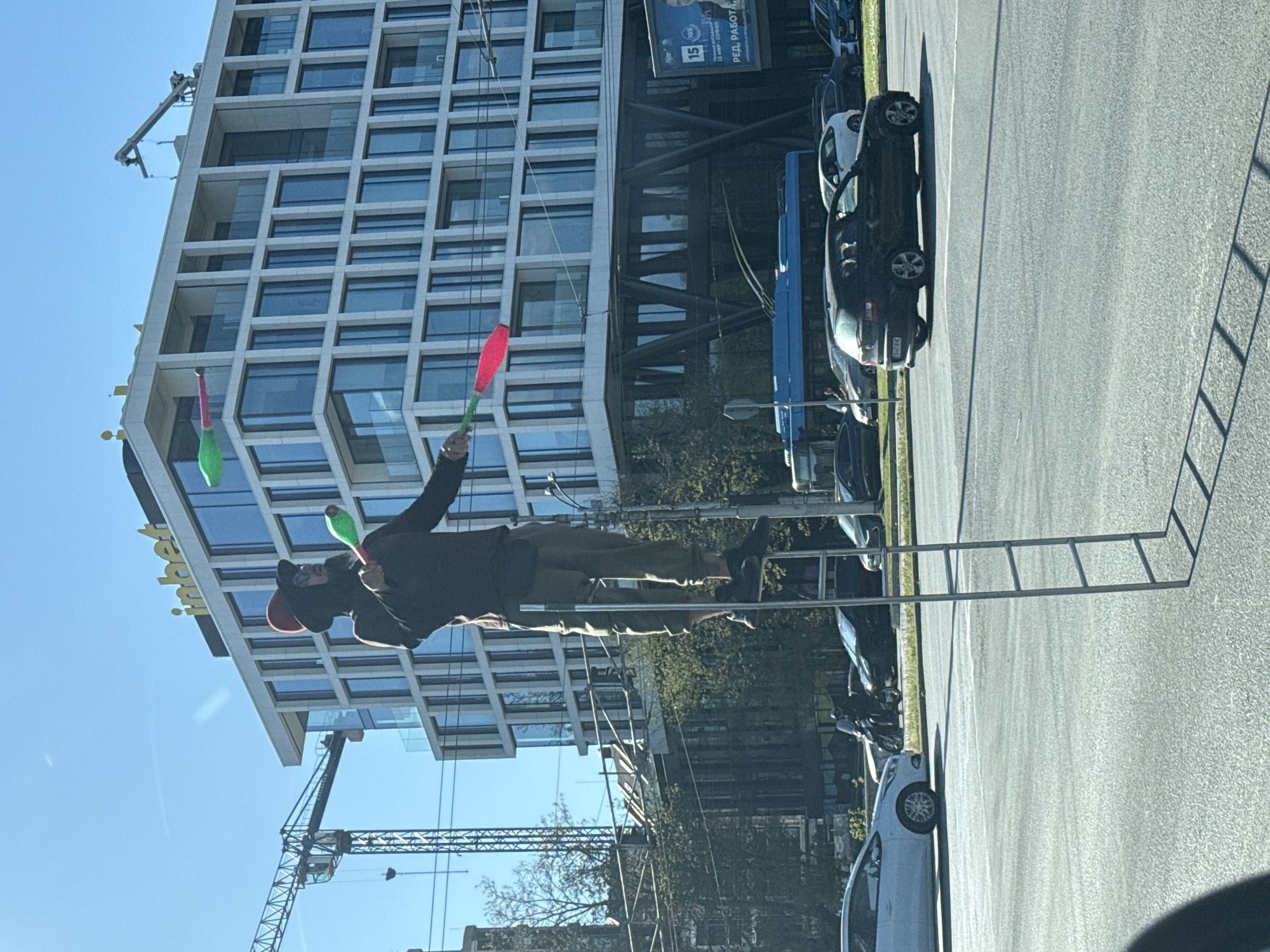 The image depicts a man juggling three juggling clubs on a sidewalk in Sofia, Bulgaria. He is wearing a dark jacket, light-colored pants, a red cap, and appears to be wearing a face covering. The juggling clubs are green, pink, and red. In the background is a modern building with a grid-like facade. A construction crane is visible to the left of the building. Parked cars are along the roadside and a large advertising billboard is visible, as well. The location is marked by a sign indicating the building is the "inbetweeen" office building in Sofia.