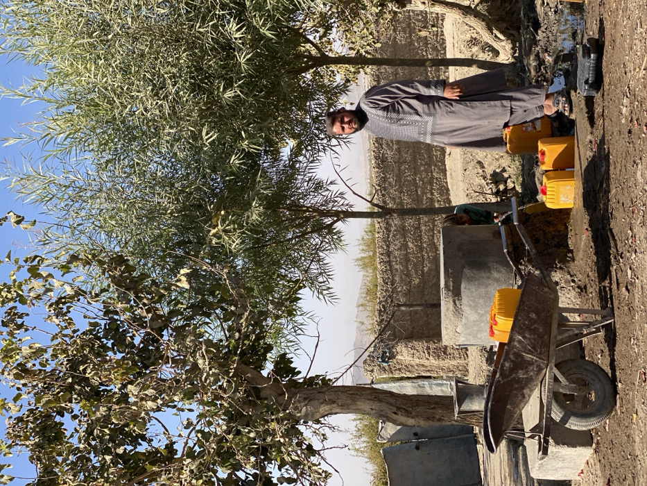 The image depicts an outdoor scene in an unspecified rural or semi-rural area of Unknown, Unknown, under a clear blue sky. In the foreground, center-right, an adult male stands, looking towards the viewer. He wears a dark grey long-sleeved tunic with white embroidered patterns on the chest and sleeves, and dark sandals. He has a full dark beard and short dark hair. To his left, a smaller individual, partially obscured behind a large, grey, cylindrical water container, is interacting with a spigot or faucet for water collection. A rusty metal wheelbarrow, containing two yellow plastic jerrycans with red caps, is positioned directly under the spigot, with water visibly dripping onto the ground. Three additional yellow jerrycans are on the ground near the main male figure's feet. A small black equipment case lies on the ground to the right of his feet. The immediate environment consists of dry, uneven dirt ground. Several trees are present: a large, mature tree with brown leaves on the far left, and multiple smaller, slender trees with narrow green leaves towards the right. A low, rough-textured wall, constructed from what appears to be mud or earth bricks, extends across the mid-ground. Distant mountains are visible on the horizon under the clear sky. On the far left, partially obscured by the large tree, several large, rectangular grey panels lean against an unseen structure.