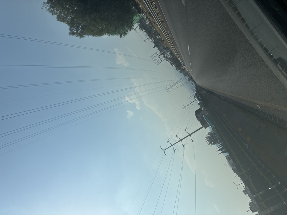 A skewed view of a highway under a partly cloudy sky. Power lines stretch across the frame above a road that recedes into the distance. Infrastructure, including towers, flanks the highway. A line of buildings and vegetation runs parallel to the road on either side. The perspective creates a sense of depth and height, emphasizing the power lines' connection between the roadside structures.