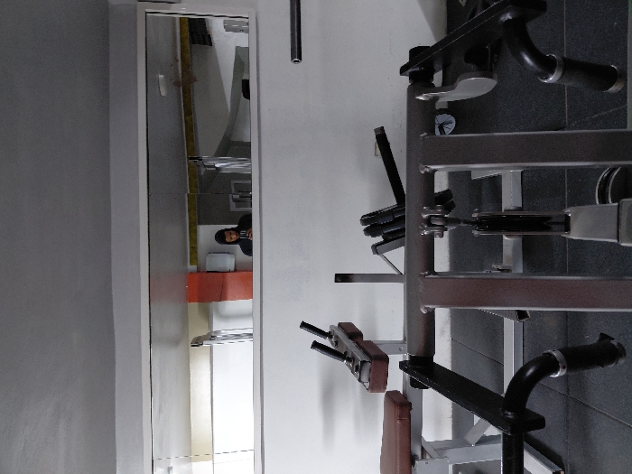 A fitness center has an exercise machine with metal supports, black handles, and brown pads. The wall has a tall mirror reflecting a person in dark clothing, a white appliance, and an orange storage unit. The room's background includes white walls and dark gray flooring.