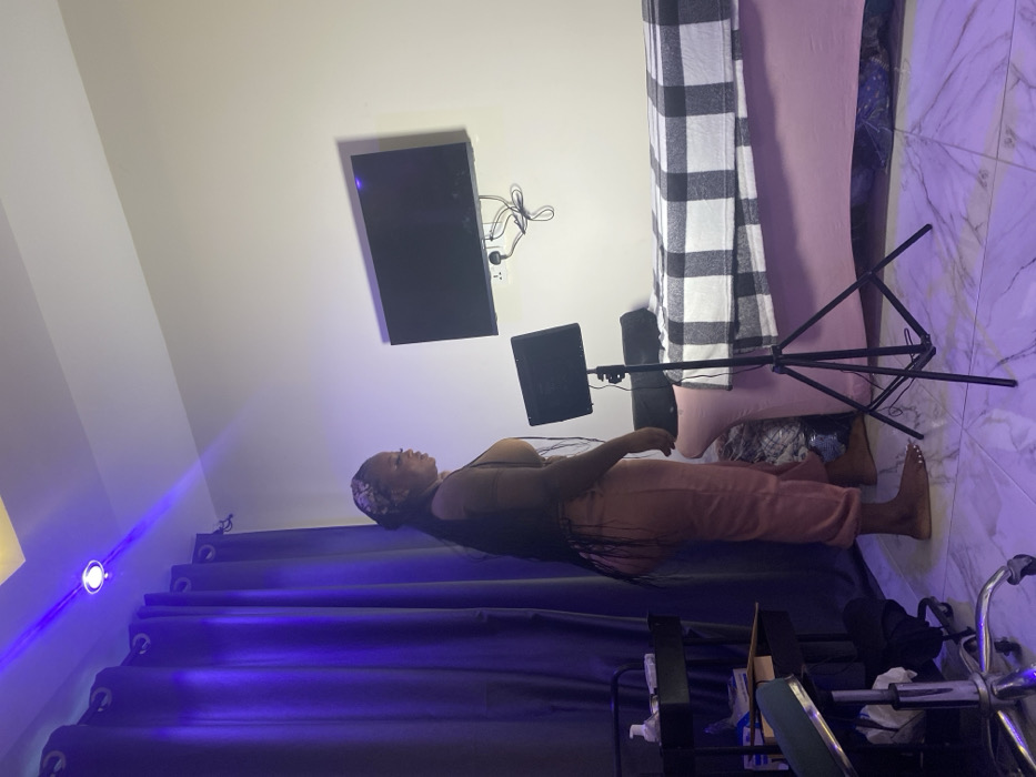 The image depicts an interior room located in Dome, Ghana. The room features white walls, a light-colored tiled floor, and dark blue curtains on the left side. Overhead, a recessed ceiling light emits a purple hue, particularly illuminating the left half of the scene. A single individual, a woman, stands barefoot in the center-left, facing right in profile. She has long, dark hair styled with a patterned headband, and is dressed in a light brown short-sleeved top and light pink trousers. Her gaze is directed forward. From left to right, visible objects include a chrome-based wheeled stool with a green seat, partially cropped, and a black multi-tiered utility cart holding various bottles and containers. In the foreground, a black tripod stand supports a rectangular light panel. To the right, against the wall, is a light pink upholstered treatment or massage bed, covered with a black and white checkered blanket. Above the bed, a black flat-screen television is mounted on the wall, powered off. Beneath the television, an electrical outlet with visible power cords and adapters is present. The woman is standing still, appearing to observe the area in front of her.