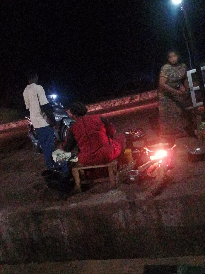 Three people are captured in an outdoor night scene. A woman sits on a small wooden stool, wearing a red quilted jacket, near a cooking setup with a visible fire. A man in a white shirt and blue jeans stands beside a parked motorcycle, possibly a customer. To the right, another woman stands on a slightly raised platform. The lighting is dim, with the fire and a nearby streetlight providing the primary illumination. A building wall is present in the foreground.