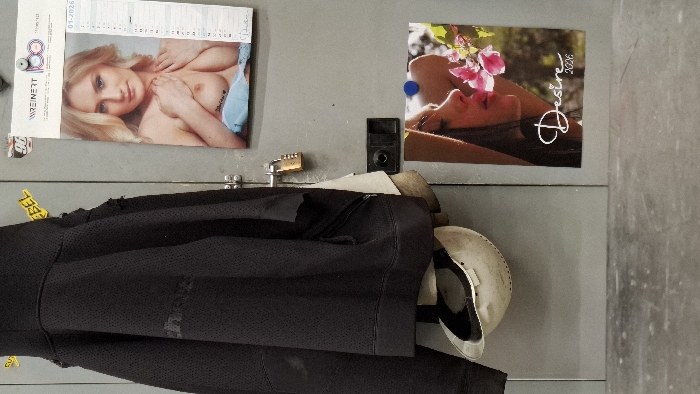A gray locker-style cabinet is covered with various items. A calendar with a woman on it hangs alongside a "Desire 2006" poster. An MP3 player is attached with a magnet. A black jacket is slung over the door with a hard hat on top. A set of keys is hanging in the middle.