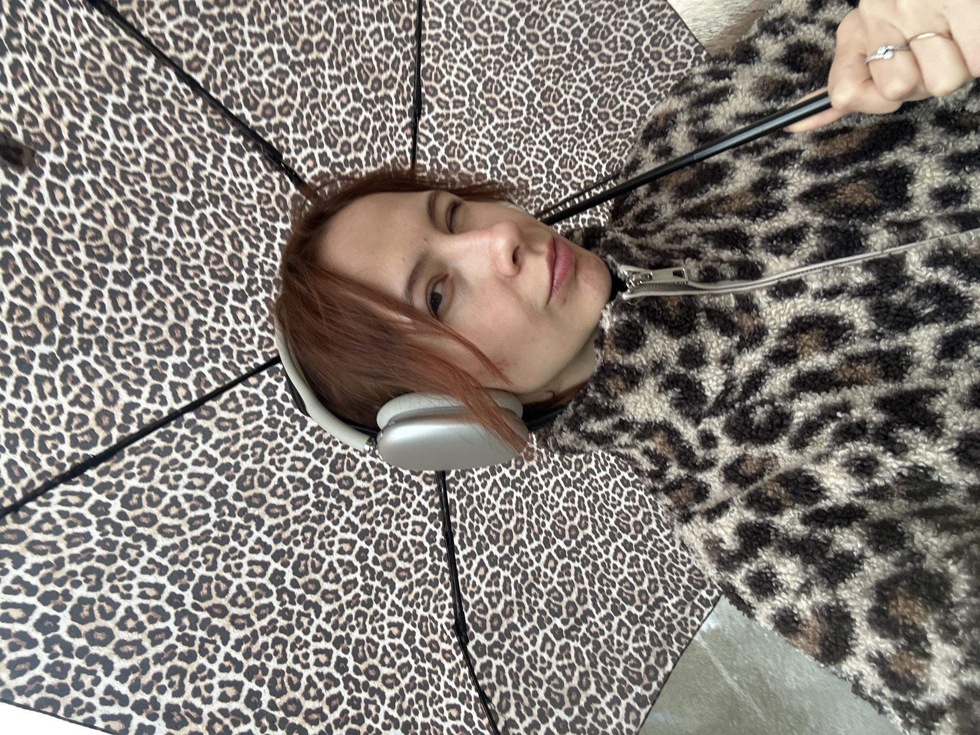 The image displays a female individual situated in Novi Sad, Serbia. She possesses reddish-brown hair and is observed looking directly forward, winking with her right eye while exhibiting a slight smirk. She is equipped with light grey over-ear headphones. Her attire includes a fuzzy, zippered jacket featuring a leopard print pattern, composed of black and brown spots on a tan base. Her right hand, adorned with a silver-colored ring (containing a clear stone) on the ring finger and a thin gold-colored ring on the adjacent finger, firmly grasps the black shaft of an open umbrella. The umbrella's canopy also exhibits a matching leopard print pattern. The immediate background is primarily obscured by the subject and the expanded umbrella, with an indistinct light-colored surface partially visible on the lower left.