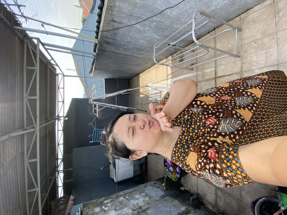 A woman with dark hair tied back is posing on a rooftop. She's wearing a brown patterned dress and making a playful face. Behind her, there's a clothes drying rack, a washing machine, and some metal framework. The rooftop appears to be a narrow space between buildings, with a gray wall and tiled flooring visible. The weather looks sunny.